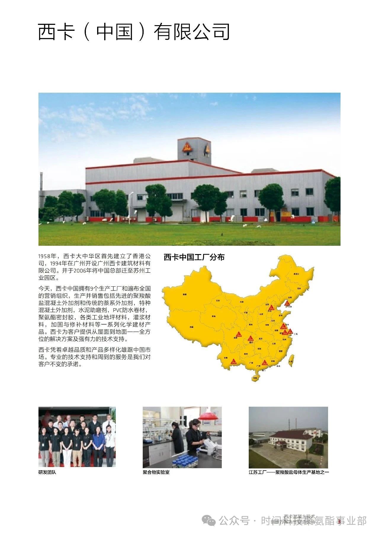 今天,西卡中国拥有9个生产工厂和遍布全国的营销组织,生产并销售包括先进的聚羧酸盐混凝土外加剂和传统的萘系外加剂,特种混凝土外加剂,水泥助剂,PVC防水卷材聚氨酯密封胶,各类工业地坪材料,灌浆材料,加固与修补材料等一系列化学建材产品。西卡为客户提供从屋面到地面——全方位的解决方案及强有力的技术支持。